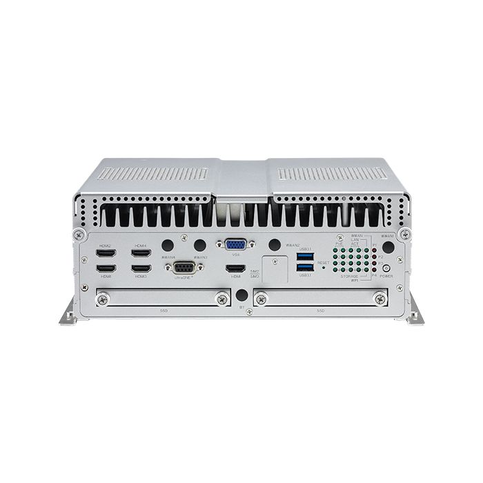 24 x LED indicators (including 4 x programmable LED)1 x HDMI 1.4b from Intel CPU (max resolution: 4096 x 2160 at 30Hz)1 x VGA (max resolution: 1920 x 1200@60Hz)4 x HDMI from MXM module1 x ultraONE+ for 10M video + audio output + 24VDC output2 x USB 3.2 (Gen2) type A (5V/1A)2 x Externally accessible SIM sockets, 1 x internal SIM socket2 x 2.5” removable SSD tray1 x Reset button1 x Power button5 x SMA antenna