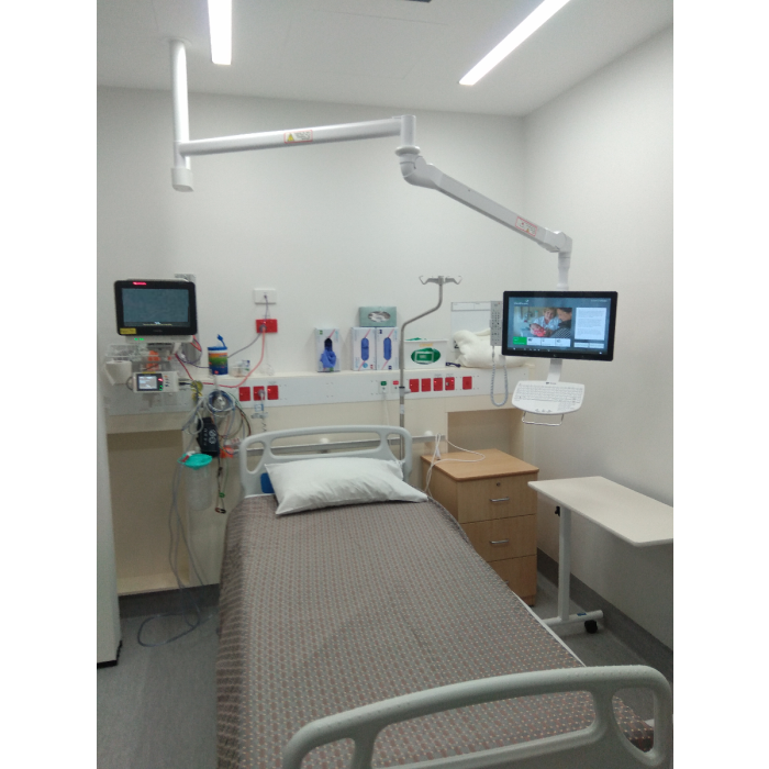The lightweight ceiling mounting arm utilises an overhead position and a central axis to provide a wide rotational span.