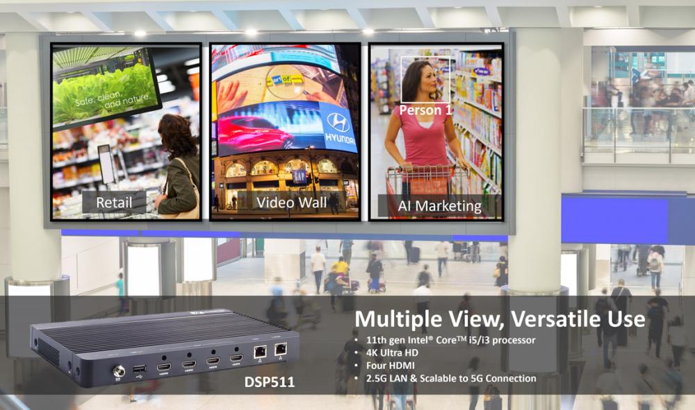 | Description | The DSP511 is a 4K Ultra HD digital signage player with four HDMI 2.0 ports and a 2.5G Ethernet port, which enhances multiple view and real-time displays. The outstanding signage player is powered by the 11th generation Intel® Core™ i5/i3 (codename: Tiger Lake-UP3) which makes it much more versatile in smart retail applications such as interactive advertisement or AI precision marketing.
