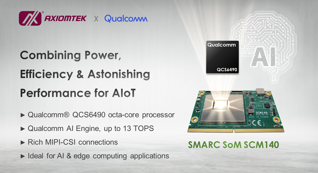 | Description | The powerful SMARC SoM SCM140 is powered by Qualcomm’s advanced chipset QCS6490. Axiomtek seamlessly integrates Qualcomm's cutting-edge technology with its ARM-based embedded solutions, paving the way for innovative developments in the embedded computing landscape. The SCM140 is crafted to empower a diverse IoT application at the edge, offering exceptional performance, cutting-edge connectivity, and advanced AI capabilities, particularly in Robot or AMR applications.